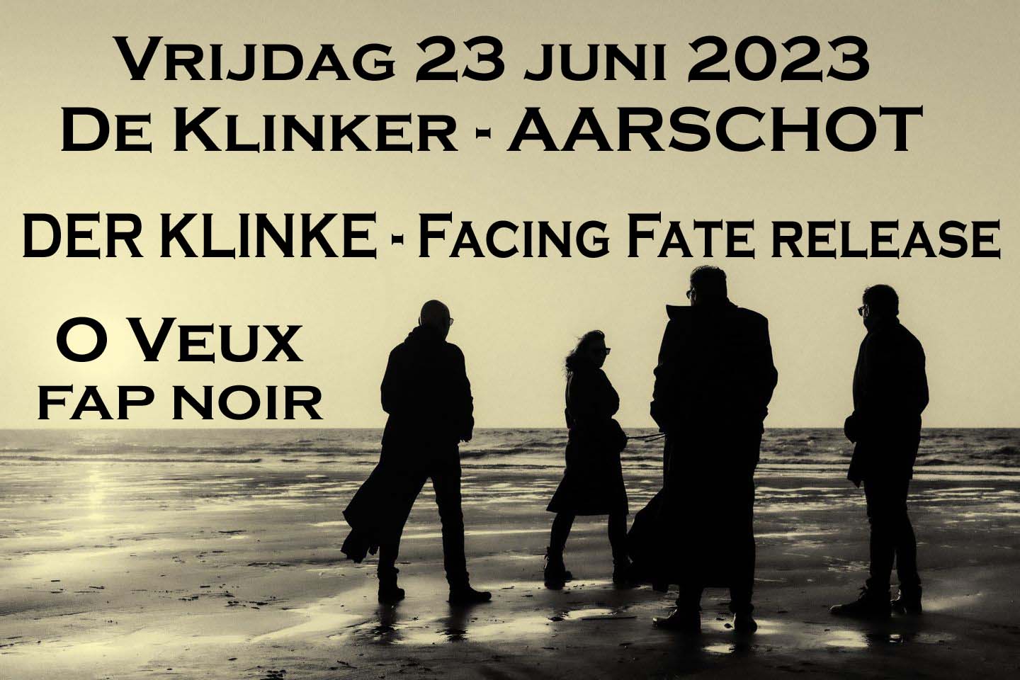 Laat het lot niet voor je beslissen, maar besluit gewoon zelf om op 23 juni naar Aarschot te trekken. Want die avond komt de Oostendse newwaveband Der Klinke er hun gloednieuwe album Facing Fate live voorstellen, dat op 10 juni verschijnt.