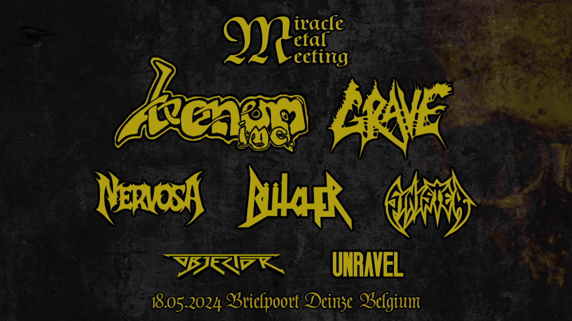 In de Brielpoort in Deinze kan je je op 18 mei 2024 volop laten overweldigen door toonaangevende bands uit de thrash- en deathscene tijdens de derde editie van Miracle Metal Meeting. De organisator Miracle vzw zet daarbij ook graag lokaal en jong talent op het podium.