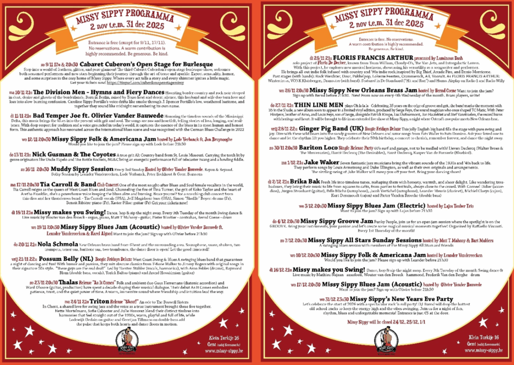 De Gentse blues- & rootsclub Missy Sippy plant onze eindejaarsperiode nù al vol met leuks! Want tot en met 31 december hebben ze alweer een swingend programma voorzien.