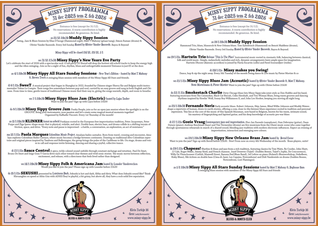 Genieten is het altijd met de gekende Missy Sippy Groove Jam, Folk & Americana Jam, Muddy Sippy Session, Missy makes you Swing, Acoustic Blues Jam, New Orleans Brass Jam en de Missy Sippy All Stars Sunday Sessions.