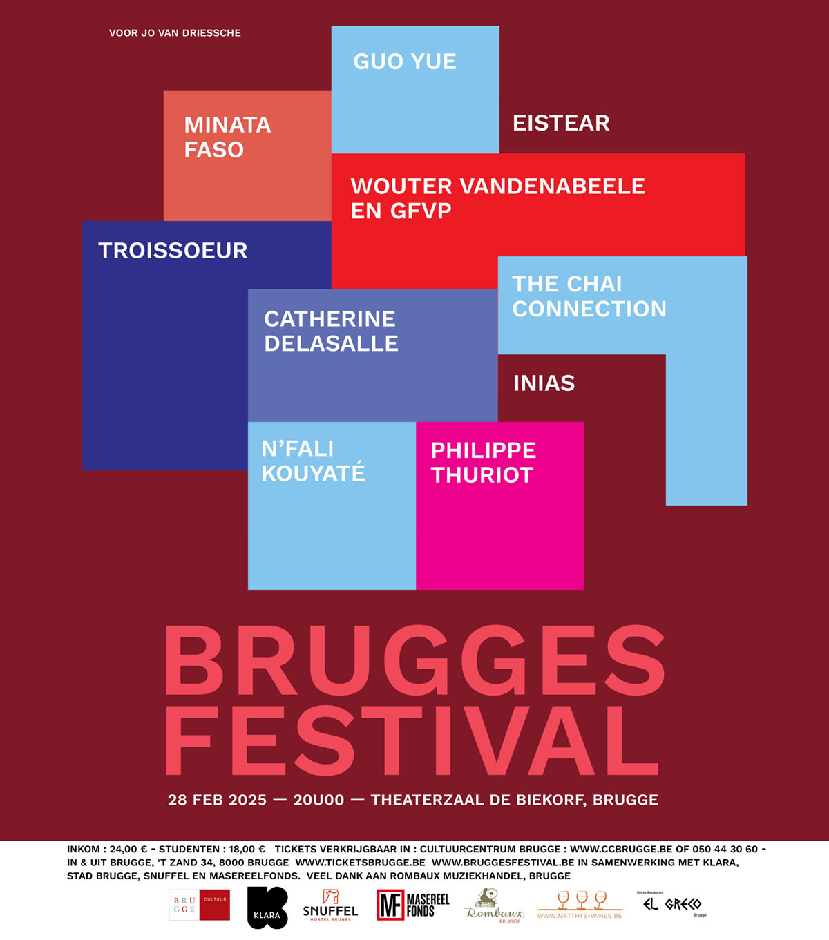 Deze muzikanten spelen op Brugges Festival 2025: Guo Yue, Wouter Vandenabeele & The Ghent Folk Violin Project, Minata Faso, Philippe Thuriot, N’Faly Kouyaté, Troissoeur, The Chai Connection, Eistear, Inias en Catherine Delasalle. Elke Vandersypen presenteert. Ze nemen ons mee op muzikale reis onder het motto De wereld, mijn dorp.