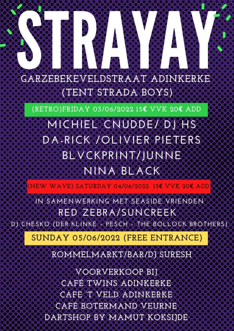 Strayay, afgeleid van Strada Boys, een 52-jarige vereniging die oorspronkelijk ontstond als supportclub van voetbalploeg KWS uit Adinkerke. Elk jaar werd er met Pinksteren een feestweekend georganiseerd. Op vrijdag Vlaamse artiesten met oa. Will Tura, Jimmy Frey, Joe Harris, John Terra,… Op zaterdag een playbackshow en het weekend werd afgesloten met op zondag een discobar, dit alles in de bekende tent op het marktpleintje. Ooit waren er nog Miss Strada Boys verkiezingen.