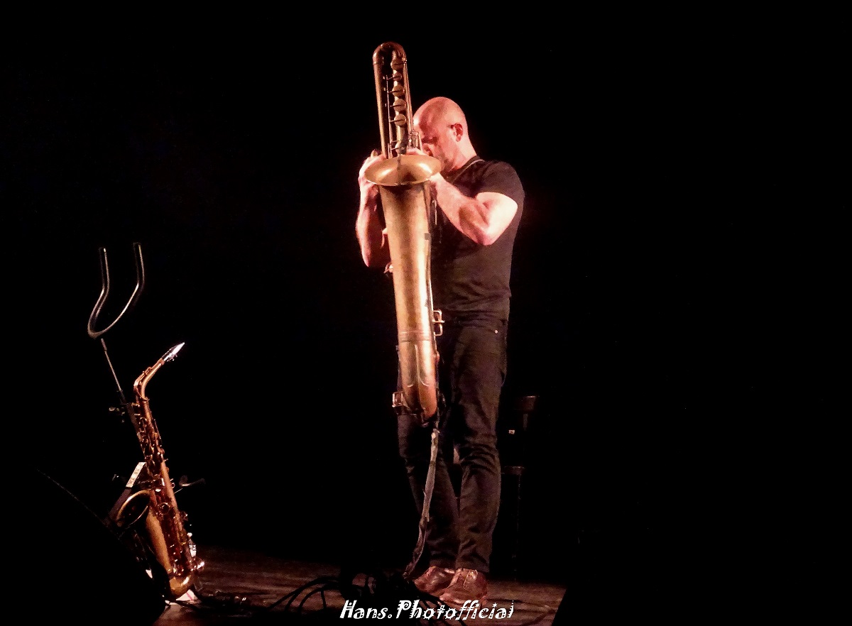 De baritonsax catapulteerde ons in een vuurrode regendans naar Afrika, want we hoorden teveel olifanten uit zijn saxhals komen om het gewoon bij Pairi Daiza te houden. De olifanten waren behoorlijk onrustig trouwens. Het is onwaarschijnlijk welke geluiden hij allemaal uit dat instrument krijgt. Hij bediende kleppen die een hard en nerveus geluid genereerden en hij gaf zelf aan dat hij zijn vingertoppen nog nauwelijks voelde. The Six heette dat olifanten-epos overigens. Hold Your Breath kwam erna. In zijn geval geen goed advies met zijn lippen rond een saxofoon.