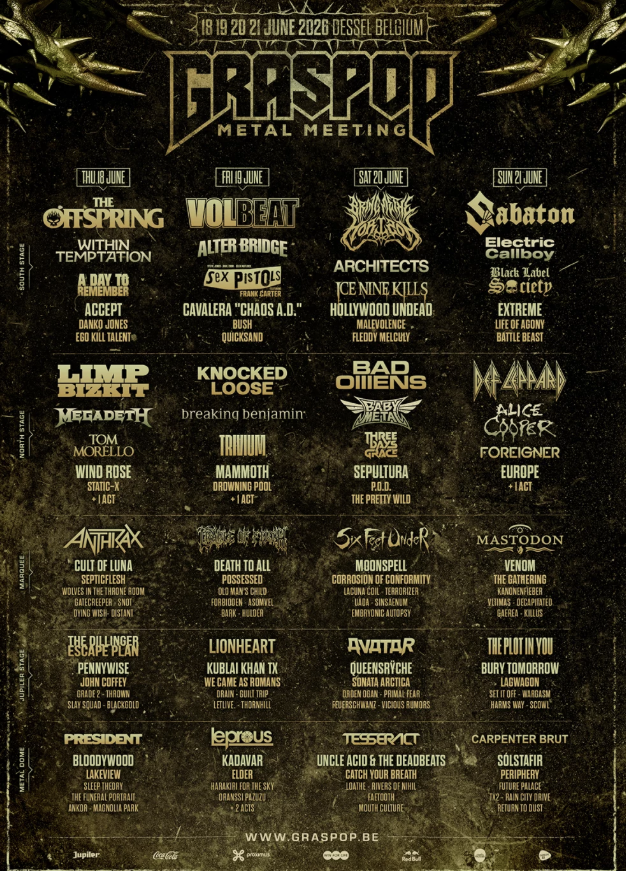 Met de aangekondigde namen laat Graspop meteen zien dat het ook dit jaar groots denkt. Onder meer Limp Bizkit, Bring Me The Horizon, Volbeat en The Offspring prijken bovenaan de affiche. Ook kleppers als Megadeth, Within Temptation, Def Leppard, Alice Cooper en Sabaton tekenen present. Daar komen publieksfavorieten als Bad Omens, BABYMETAL en Architects nog bovenop.