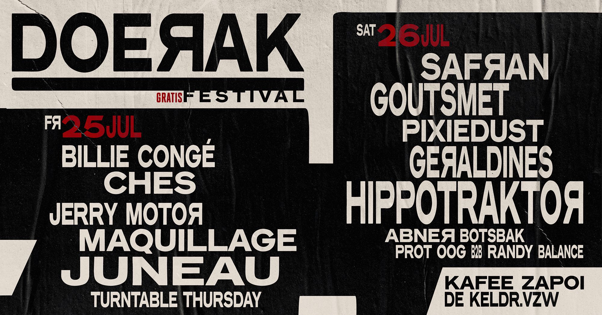 Op vrijdag 25 en zaterdag 26 juli transformeert de Mechelse Onze-Lieve-Vrouwstraat voor het vierde jaar op rij tot een gratis muziekfestival, gecureerd en georganiseerd door Kafee Zapoi en DE KELDR. Een flinke dosis Mechelse rock-’n-roll, dj’s, fijne biertjes en lekker eten zijn verzekerd die twee dagen op het Doerak Festival.