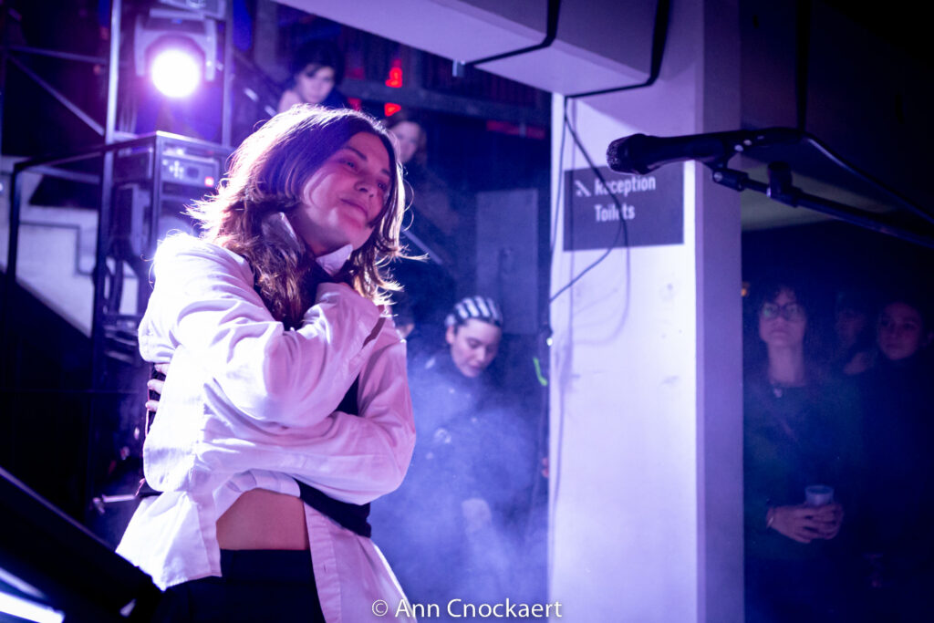 Eenmaal terug beneden passeerden we het project Moenen & Mariken. Een kunstzinnige performance die zorgde voor de alchemie tussen woord en techno, maar vooral zenuwachtig klonk en ons liever buiten in de koude, waar vapes ronde wolkjes bliezen in de ijle lucht, liet acclimatiseren.