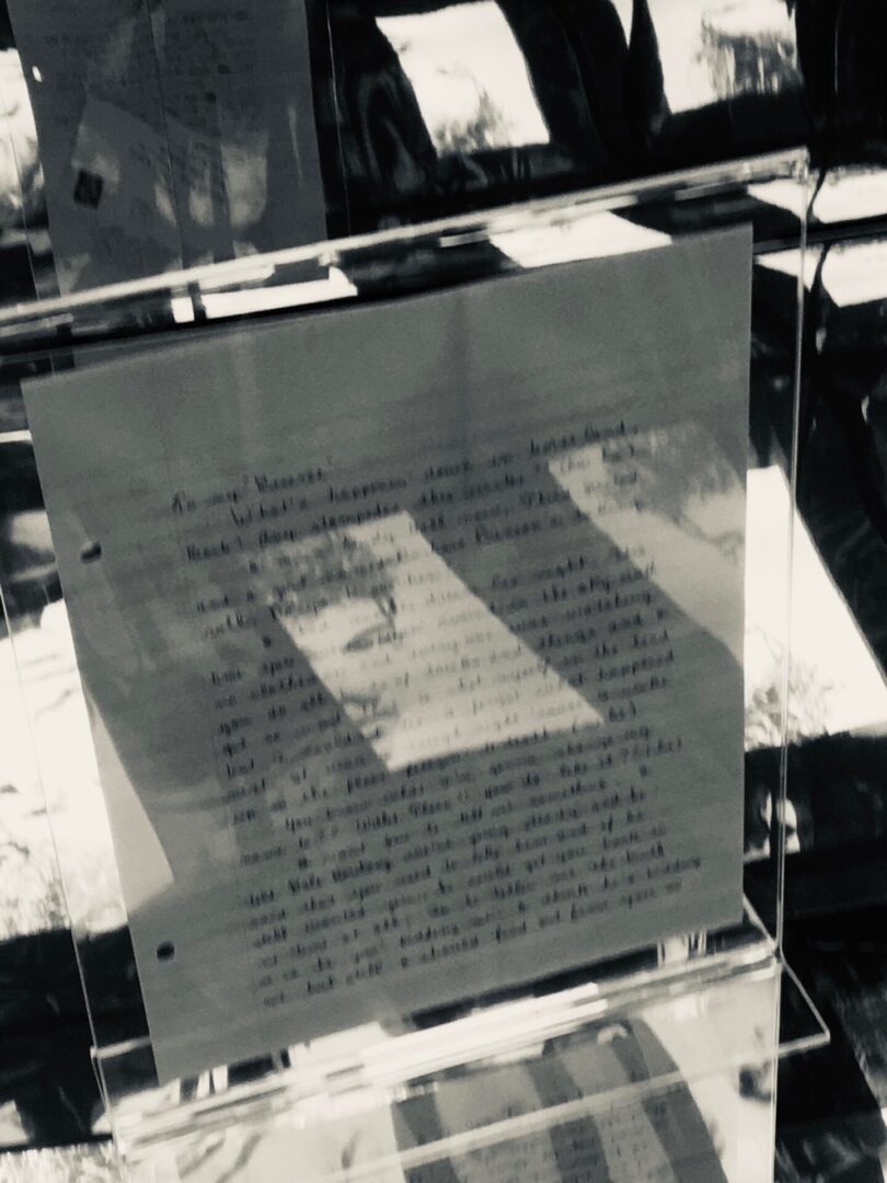 Toen we vorig jaar hoorden dat een kleine selectie van die manuscripten van Bob Dylan werd geveild, zagen we onze kans schoon om een Nobelprijswinnaar in huis te halen. Hier in deze glazen kast zien we één van die brieven uit de collectie van 42 brieven geschreven en ondertekend door Robert Zimmerman. En deze brief is heel bijzonder! Bob leefde en studeerde in 1958 nog in Hibbing. Hij was toen 17. En zoals elke jongere van die leeftijd had hij dromen. Hij had de kracht om het groots te zien. Uiteraard gaat het in die brief over de liefde. Maar het gaat ook over drama en kleine problemen van een jonge volwassene. Maar bovenal toch over dromen. In deze brief heeft Bob het over zijn grote droom. Hij wou beroemd worden en één miljoen platen verkopen. Die droom kwam dus uit. Hij verkocht een veelvoud van dat aantal. Dylan verkocht zowat 125 miljoen platen. (Een gigantisch aantal bootlegs niet meegerekend, nvdr.) Bob Dylan dacht daar over na en deelde dit met Barbara (zijn lief aan wie deze brief gericht was, nvdr.). Hij schreef haar ook dat hij misschien maar beter zijn naam veranderde in Little Willie of Elston (Bob Dylan gebruikte later meermaals het pseudoniem Elston Gunn, nvdr.).