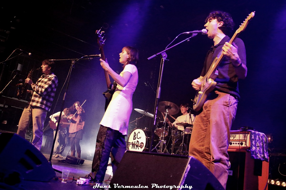 Black Country, New Road – die we verder voor het gemak BCNR zullen heten – was dan aan zet. Hun concert was dus uitverkocht, en dat is logisch voor een band waarvan gezegd wordt dat ze muziek een nieuwe dimensie en impuls geven. De Orangerie heeft een langwerpig podium en is dus uitermate geschikt voor de opstelling van 7 muzikanten. De diversiteit van de instrumenten geeft meteen ook aan dat we geen doorsnee concert moeten verwachten. Het was niet de vaste violiste Georgia Ellery maar ze werd uitstekend vervangen. Los van de tradtionele drums (Charlie Wayne) en gitaar (Luke Mark) viel vooral het kwartet links, rechts en centraal op. Isaac Wood stond als frontman en zanger/gitarist uiterst links als moderne buitenspeler geposteerd. Saxofonist Lewis Evans wordt centraal geflankeerd door bassiste Tyler Hyde, en rechts zat en stond de bevallige May Kershaw achter de ‘Korg en Roland’ synthesizers.