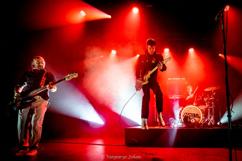 Customs, piekfijn uitgedost, trapte af met The Matador en schakelde meteen naar een verschroeiend tempo. De vierkoppige band liet amper ademruimte tussen de bijzonder strak gespeelde nummers. Uit het zevental nieuwe nummers dat de band de voorbije zes maanden uitbracht, werd gretig geput. Regina groeide vroeg in de set uit tot een hoogtepunt, mede dankzij een stuiterende Kristof Uittebroek, die met zijn flamboyante dansmoves kon doorgaan als het hypothetische liefdeskind van David Byrne, Ian Dury en Hemlock Ernst.