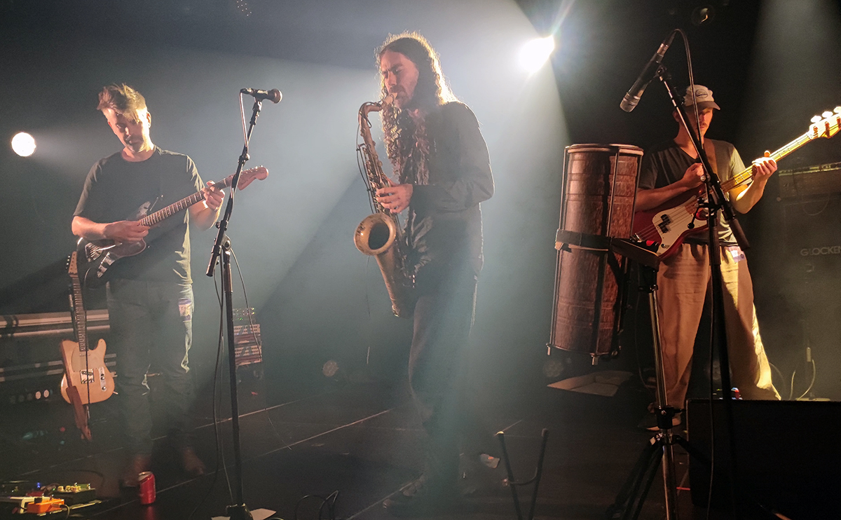 In Bee Jive stuwden moddervette bas en strakke percussie de compositie aan een manisch ritme, met ook nu prachtig saxwerk en een heerlijk helse gitaarsolo. Klonk een stuk steviger dan op de plaat. En dat gold ook voor Echolocation, dat tegelijk Oosters én kinderlijk aandeed, gretig gitaarwerk, prachtige lead van de sax, brommende bas, performante percussie weerom. Dan een breakdown met een geweldig bas-loopje. Zalig!