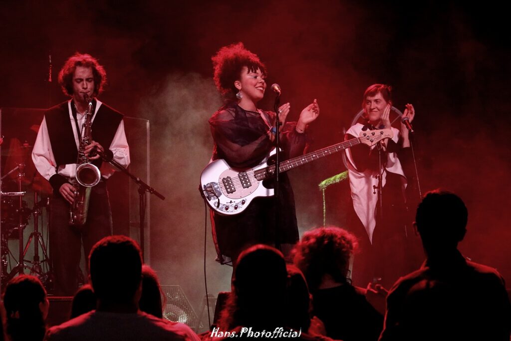 De straffe volledig Antwerpse band die haar omringt wordt gevormd door drummer Simon Pas, gitarist Michiel Los, saxofonist Kasper Van Broeckhoven en trompettiste Julia Warmerdam. Deze Julia kreeg jankende geluiden uit wat leek op een gigantisch pizzames. Ze ging het wel met een strijkstok te lijf. Het bleek gewoon een zingende zaag te heten. Cool!