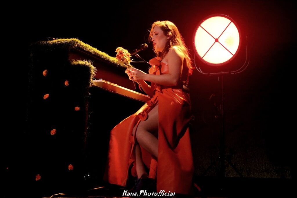Alice kwam als eerste het podium op, nam plaats achter de piano en zette een Elton Johnnebril op. Als we haar van één ding niet kunnen verdenken, dan wel van een gebrek aan kledingstijl. Haar oranjekleurig galakleed paste wonderwel bij de goudsbloemen op de piano. Het was de laatste avond van de Visions Eurotour en gelukkig liep de zaal alsnog behaaglijk vol. Het was haar eerste keer in België buiten Brussel (AB 2018 en Botanique 2019), festivals tellen we even niet mee. Het dient bovendien te worden onderlijnd dat de Mertoneesjes in de zaal fervent maar beleefd waren. Alice bedankte een vurige meid uit Brazilië om speciaal naar hier te zijn afgezakt maar na het concert vertelde de Braziliaanse me dat ze momenteel in Leuven woont, op 3 straten van het Depot.