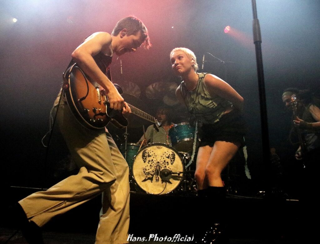 De ode aan Pamela Anderson in het overheerlijke Aerobics zette het Depot al snel aan het feestdansen. De choreo werd lustig nagespeeld in de zaal. Kaat is van de streek en al haar maten en fans waren op de afspraak wat resulteerde in een wedstrijd die ze nooit kon verliezen. Zo was er de ongetwijfeld ingestudeerde interactie met een vriendin die voor de gelegenheid een Hannah mocht zijn en zeker acteerambities mag koesteren. Aangezien Taal = God volgde meteen een bijzonder straffe Spinvis-cover Tingeltangel Hersenpan. Het was een constante lijn die de band de ganse show doortrok. De nummers werden met een felle rocksaus overgoten en we mijmerden een avond lang naar de glorietijd waarin Pearl Jam met een song als State Of Love And Trust en Radiohead met een epische gitaarsong als Blow Out kwamen aanzetten. Noem het gerust een Helmet-effect want het kwartet liet bijna alle nummers in de laatste minuut labelen met het etiket “punk op eigen risico”.