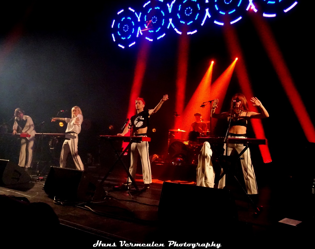 Vier synthesizers stonden in Kraftwerkmodus opgesteld. Bovenvermelde boegbeelden werden netjes geflankeerd door de sinds vorig jaar nieuw aangeworven zangeressen. La Femme heeft al een flink uitgebouwd netwerk ex-zangeressen. Grappig hoe de felblonde Nina Giangreco en de roodharige Ysé Grospiron een aanvankelijk statische ABBA-feel opwekten met mooi gecombineerd gezang tijdens Nouvelle-Orléans. Het opwindende eightiesgeluid van Cool Colorado en Mycose veranderde de AB al meteen in een kolkende danstempel en de band werd meegesleurd in deze enthousiaste rollercoaster. Magnée stond geen moment meer stil, haalde de leukste metalclichés boven door zijn keyboard als gitaar te martelen en Grospiron had het snel te warm en verwijderde het meest overbodige deel van haar stijlvol wit maatpak. Zelfs de vrouwen rond ons kregen het er benauwd van. “Elle est trop sexy”. Feit is wel dat Ysé een vooraanstaande rol vertolkte gedurende de volledige set. Ze nam het merendeel van de vocals voor haar rekening, zoals in het sensuele Me Suive waarin ze vooraan het podium een sterk staaltje sixties Bardot voor haar rekening nam. Ook haar swingende uithalen met vaste stem en sierlijke dansmoves tijdens het heerlijke Va maakten danig indruk.