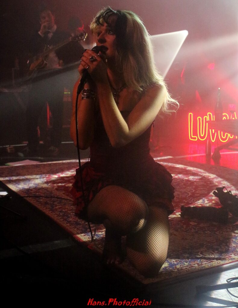 De uitverkochte Rotonde maakte zich dan op voor de komst van Luvcat. Kan een intro muziekje nog toepasselijker door de boxen schallen dan The Lovecats van The Cure? En erna psychedelica van The Velvet Underground en Where The Wild Roses Grow van Nick Cave en Kylie Minogue waarmee we eigenlijk de invloeden en het geluidsspectrum van Sophie perfect gekaderd hebben. Hoe cruciaal Sophie in het geluid van de band is bleek meteen toen we de gezichten van de ‘luvcatters’ ontmaskerden als ‘big societeers’. Luvcat klonk inderdaad totaal anders. “Come and kiss my Lipstick”. Sophie was de begeerlijke diva waarvan de fans droomden. Ze was onder de indruk van de prachtige zaal. Nog bijna 100 ticketzoekenden zaten nu gewoon thuis, terwijl Sophie met gitaar in een Alien veranderde en een bloedmooi nummer speelde dat een hoog Fleetwood Mac-gehalte had.
