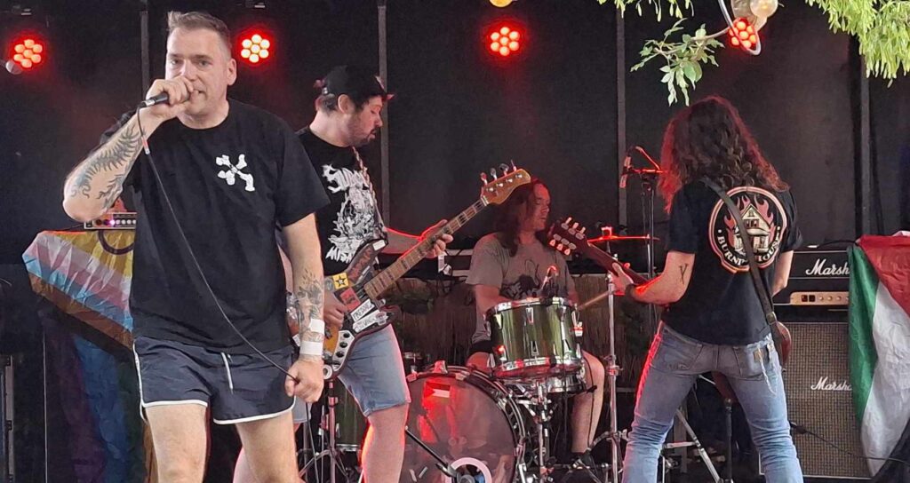 Ze jaagden er op een strak tempo het repertoire door, met veel plezier, hardrockposes met de gitaren maar ondertussen wel punk spelend, terwijl zanger Pieter Dewulf al snel genoeg had van dat podium en gewoon tussen het publiek aan het moshen ging. Een wild feestje dus, en hoe plezant kan het niet zijn als Fuck That Weak Shit, het lijflied van punkhol The Pit’s, door velen luidkeels wordt meegebruld.