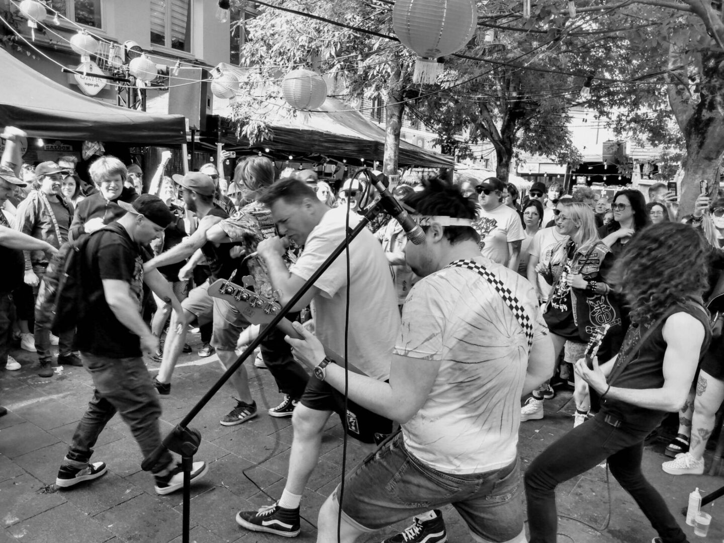 Twee seconden in hun set en er was al een helse moshpit aan de gang. Wij stonden wijselijk, met onze stramme botten, aan de andere kant, ook omdat onze jongste gewoon wilde genieten en niet tussen een zwik uitgelaten, half bezopen moshers wilde staan.