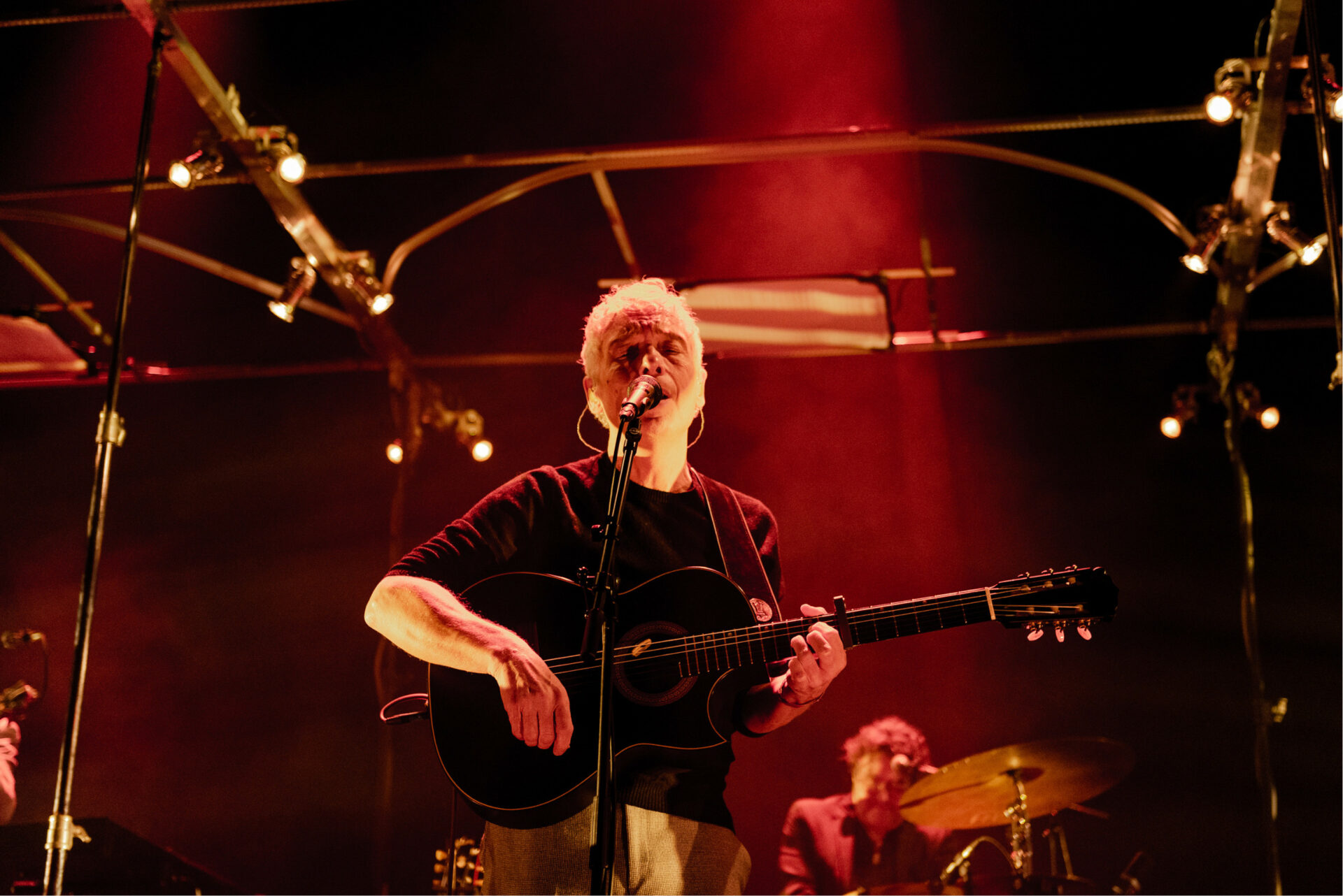 Na een openingsnummer, samengesmolten met Raymond van het Groenewoud’s Twee Meisjes Op Het Strand, begon Spinvis met veel nadruk en handgebaren te vertellen. Twintig jaar geleden waren ze voor het eerst in de Ancienne Belgique: Spinvis en zijn vijfkoppige ondersteunende band vol multi-instrumentalisten. Naast de gewoonlijke drum, bas en gitaar telden we nog cello, viool, trombone, keyboard en trompet. Daarna zijn we gestopt met tellen. Wat ons ook opviel was dat elk bandlid vlekkeloos hun instrumenten kon combineren met zang. 18 november 2021 staat in ons dagboek gegrift als de eerste keer dat we een cellist zagen zingen; rechtstaand en met een keyboard binnen handbereik. De laatste keer dat we omver geblazen werden door zo’n niveau van multi-instrumentalisme was tijdens Half Moon Run.