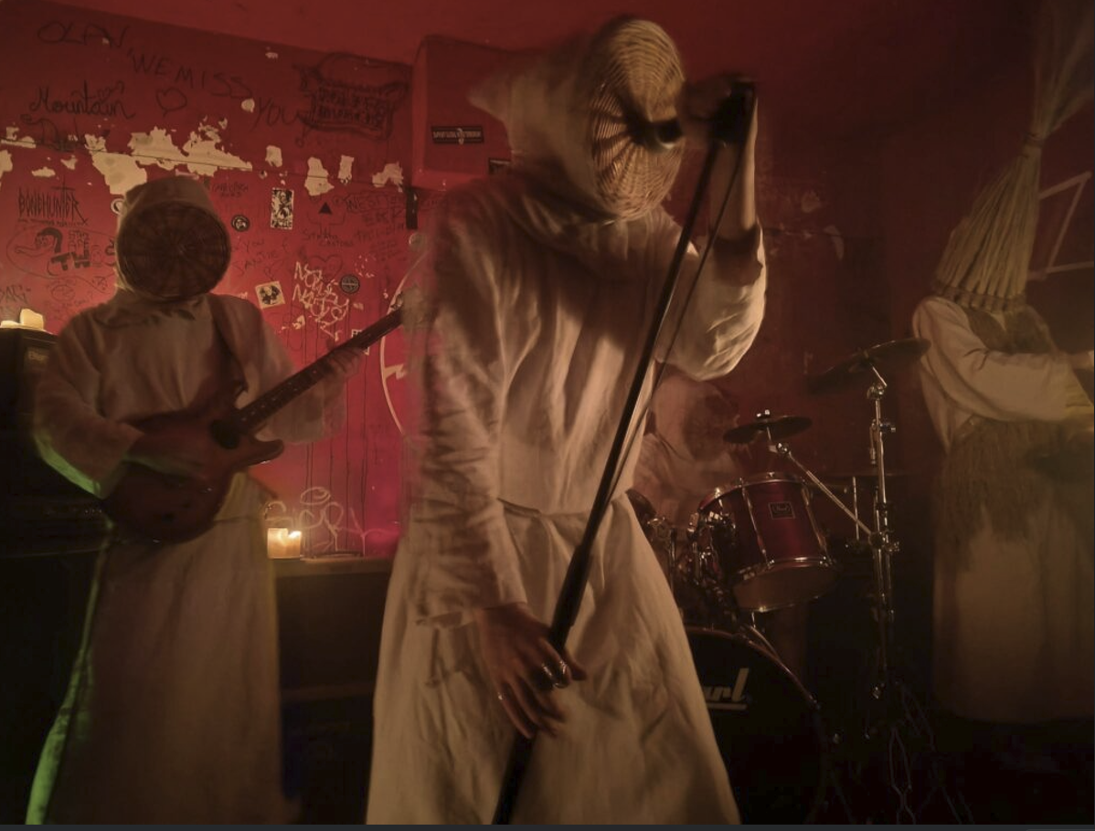 Na een korte podiumwissel betraden enkele heren het podium om alles klaar te zetten. Een band als elke andere. Maar dat was buiten de waard gerekend. Ze verlieten kort het podium en kwamen, begeleid door een vrijwilliger, het café weer binnen richting podium, getooid in maskers / hoofddeksels die ze ook in de getoonde videoclip op hadden. Ze zagen geen flikker door die dingen, maar het zag er magistraal uit, vooral de toetsenist wiens hoofddeksel zowaar net het plafond niet raakte. Warm zal hij het gehad hebben, op zoek naar een streepje licht om zijn instrument te kunnen bespelen. Een paar kaarsen op het podium, een vaas verlepte bloemen en hop, ze begonnen aan een set hemelse eigenzinnige door imkers en bijen geïnspireerde set blackmetal om tenen en vingers bij af te likken.