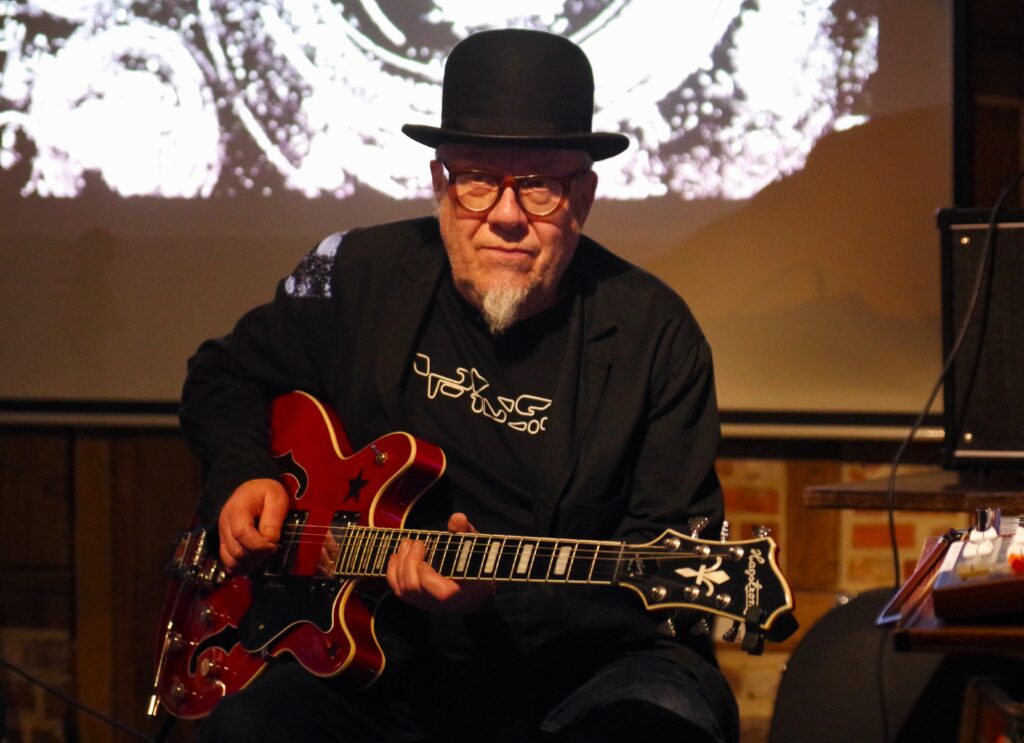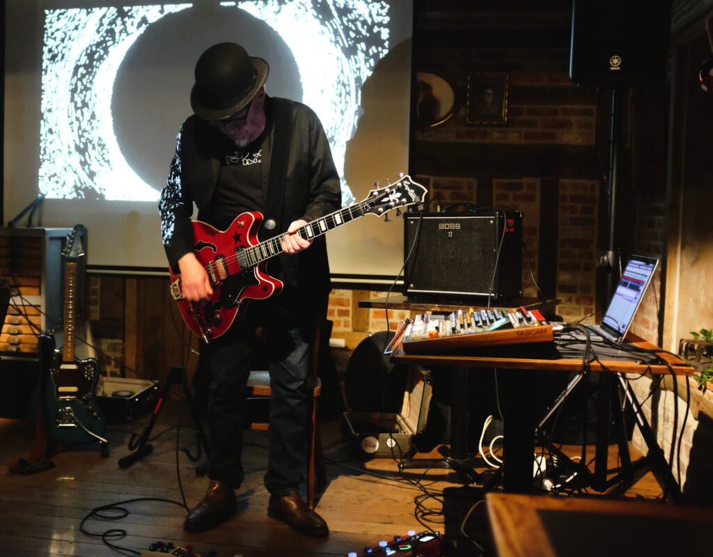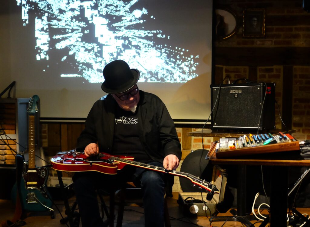 Vergult zette zijn hoofddeksel op en presenteerde een avontuurlijk optreden dat op het achtergrondscherm aangekondigd werd als ambientjazz. De gitarist puurde een reeks loops uit de trillende snaren, waaraan hij ook nog eens het nodige riffwerk toevoegde. Dit alles stolde tot een soundtrack die moeilijk in één of meerdere vakjes te plaatsen viel. De balsturige klankontwerpen werden vergezeld van ambient, soundscapes en elektronische effecten, deels zelf geproduceerd door Vergult en deels via laptopbegeleiding tot stand gebracht. De gitaar klonk zowel jazzy, jaren ’80 poprock- als krautrock-achtig, met een snuifje Tortoise-complexiteit erin verwerkt.