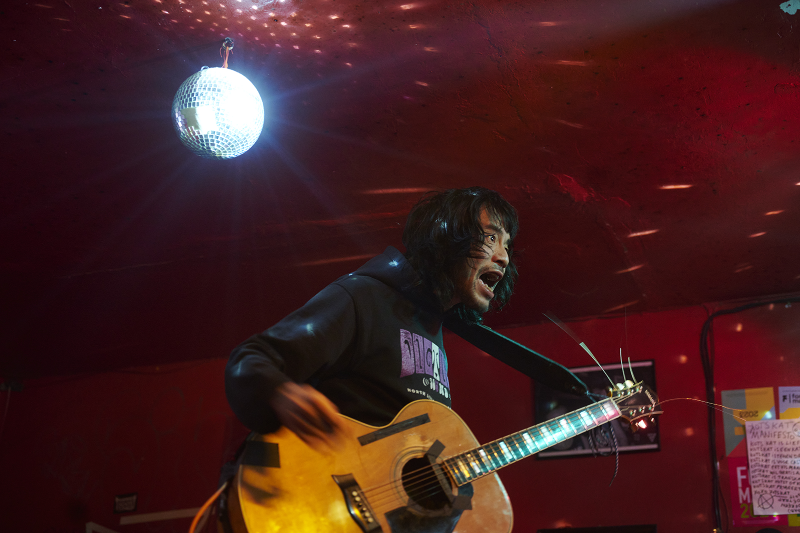 En wat bleek? Die gekke Japanner die al de hele tijd voor onze neus zat te genieten van Landrose, was dezelfde die als Kenmujo de boel eens op stelten zou gaan zetten. Een akoestische gitaar die werd versterkt, een pedaal die alles als een stel stampende klompen deed klinken en een kerel die inderdaad zo gek als een deur zijn performance deed.