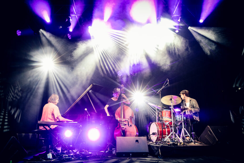 Om 21u30 mocht Steiger eerst zijn rentree maken op de Belgische jazz podia. De band ontstond zo’n 10 jaar geleden en leek een grote toekomst tegemoet te snellen tot corona en heel wat zijprojecten van de bandleden er anders over beslisten. Maar kijk, Gilles Vandecaveye-Pinoy, Kobe Boon en Simon Raman vonden elkaar terug, releasten eerder hun eerste single in 4 jaar (Gauchoman) en zijn hoogzwanger van hun album Mowglowski’s First Take dat op 17 oktober zal verschijnen.
