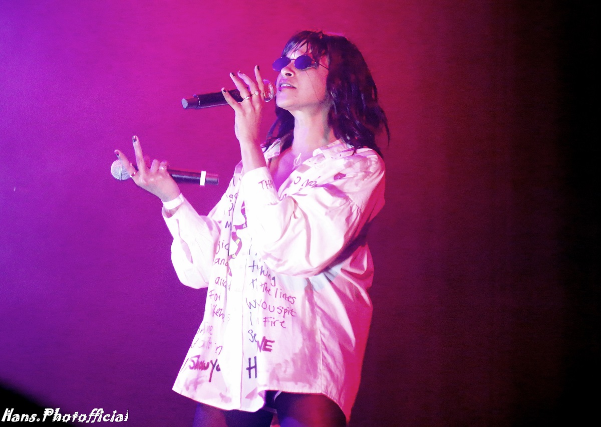Hij startte op gitaar, de elektrobackingtrack liep en zij zong. Op haar – vrij dof donkere – zang hoorden we veel effecten, waardoor er wel opwindende shouts, screams, gehijg-jes  en woordenstoten doorheen de beats klonken. Af en toe wisselsen ze van instrument, werd er ook live synth gespeeld. “I was born in the dark.”