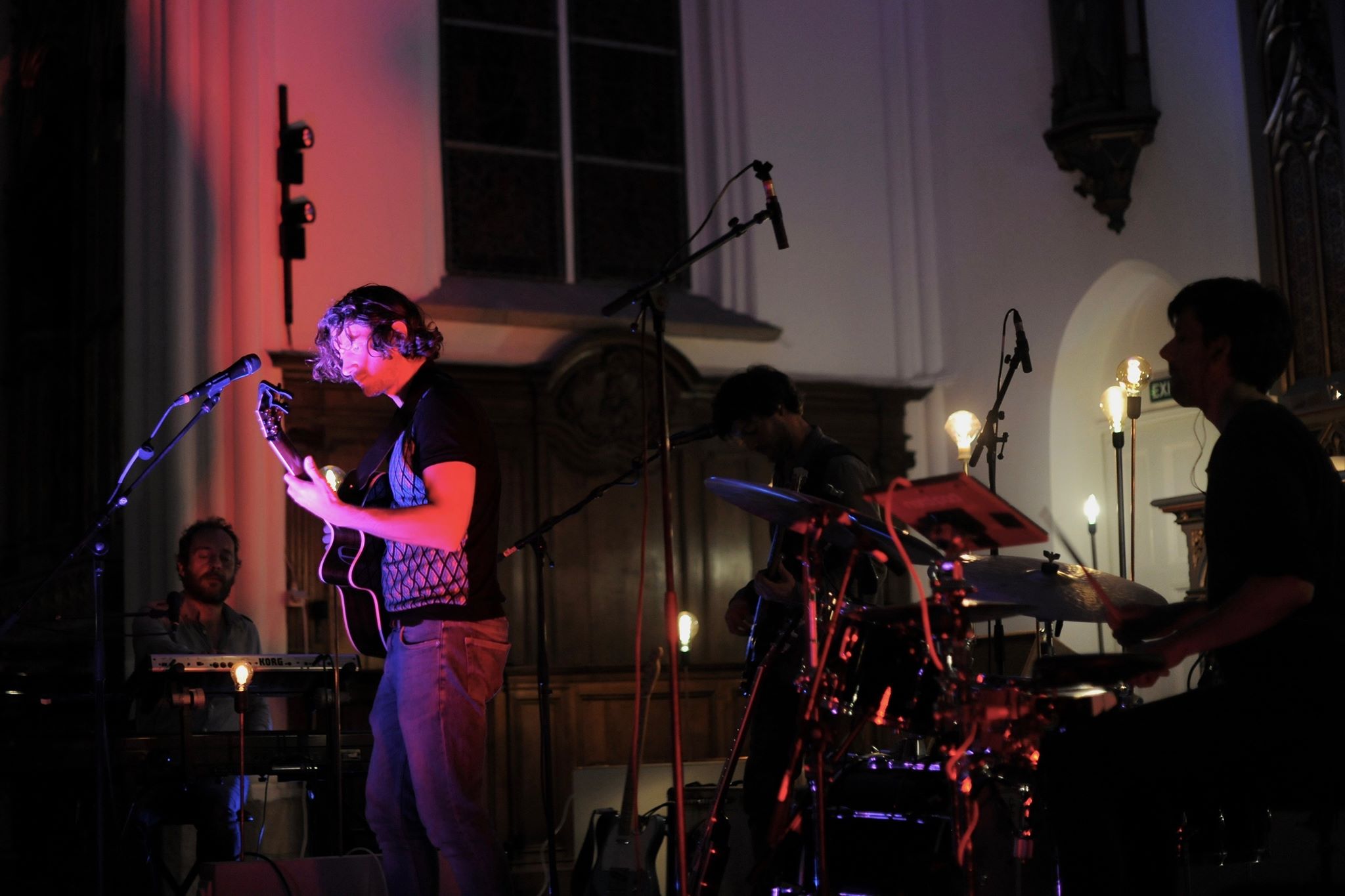De kerk van Gontrode in Melle is feeëriek uitgelicht voor het eerste concert in de 90seats90minutes-reeks. Om negen uur zijn de negentig zitplaatsen ingenomen. MAUGER bijt de kop eraf, en die hebben met Sunday Competition een knappe debuutplaat uit.