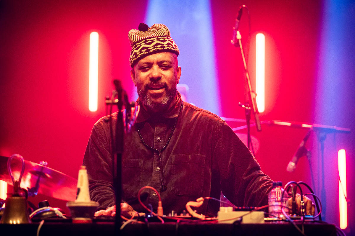Gay zit midden het podium aan een kleine tafel met daarop allerlei muzikale prullaria en enkele effectboxen. Naast en achter hem zijn vast kompanen aan de drums, op gitaar en achter een soort van bombardon. Hij zit, staat, praat, roept, ratelt met een koe- of ander soort bel, gesticuleert, speelt trompet en vocaliseert zich een weg doorheen een set waar je op het eerste gehoor kop nog staart aan krijgt. Vaak bekruipt je het gevoel dat wat hij doet, ter plekke wordt uitgevonden en improvisatie zal zeker wel aan de orde zijn. Toch begonnen we stilaan orde in de chaos te zien nu we de man een tweede keer aan het werk zagen. Er is een plan, alleen is dat in potlood getekend en zijn de strepen soms wat slordig uitgesmeerd. Maar hoe spannend was het toch weer om hem aan het werk te zien! Absolute top dit!