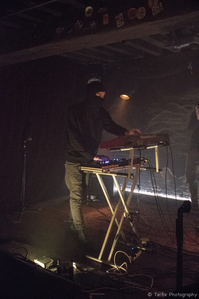 En zo betrad de man het podium geheel gemaskerd, ons een set vol vette harde electronic body music en old skool rave en breakbeat serverend. Front 242 meets The Prodigy. Alleszins volop voer voor dansbeentjes, voor wie dat wenste.