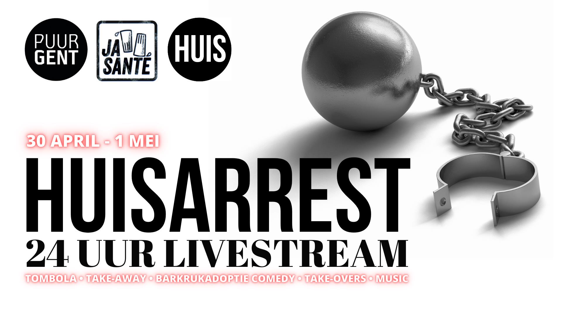 Huisarrest loopt van vrijdag 30 april 19u to zaterdag 1 mei 19u. Dit evenement is ook onderdeel van de broodnodige crowdfunding die Huis heeft opgezet via Ja Santé met de steun van Puur Gent.