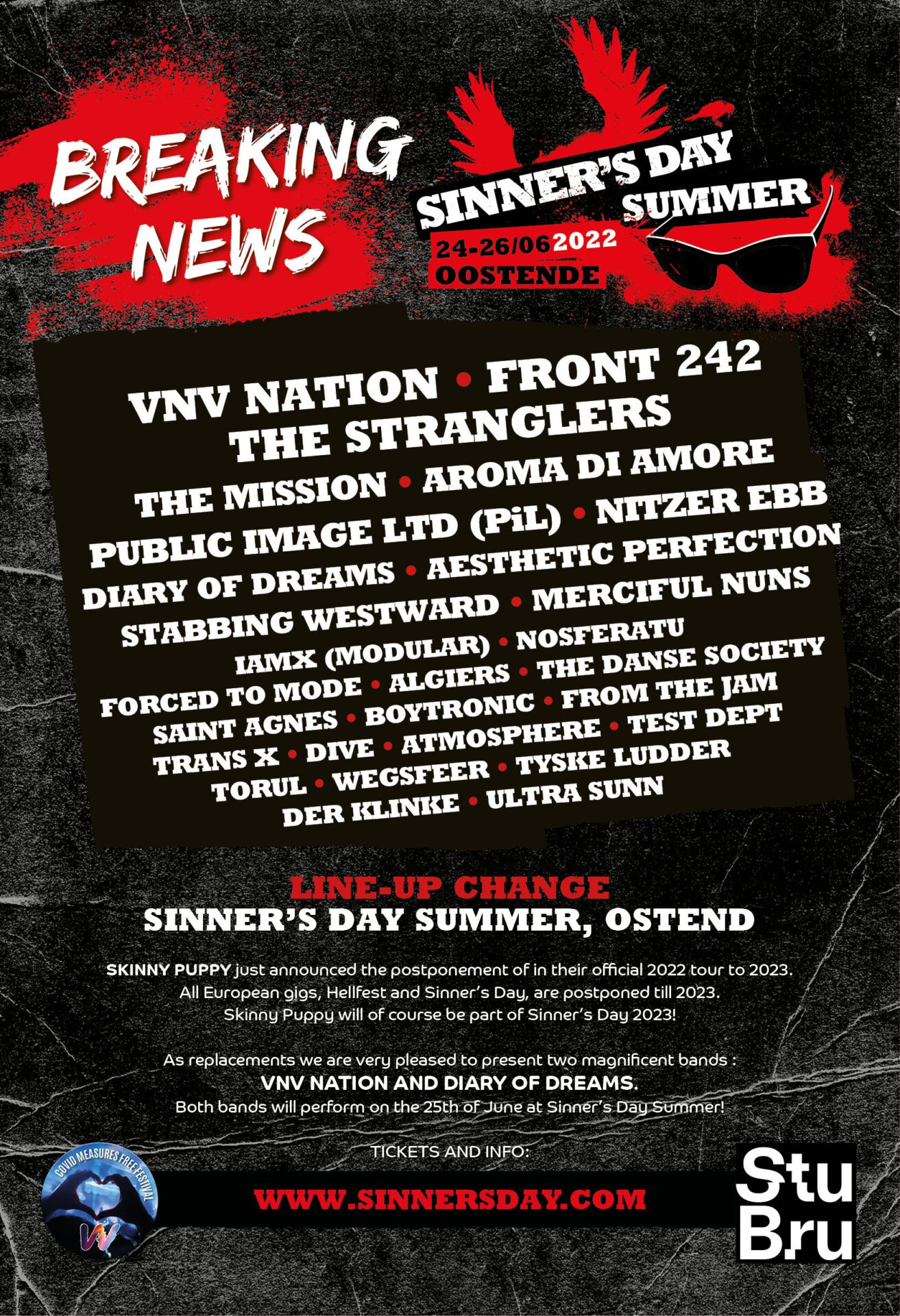 Voorlopig een band minder, maar twee andere in de plaats, want VNV Nation en Diary Of Dreams werden aan de affiche van 25/6 toegevoegd, wat de affiche – naast de andere knappe namen die reeds op de affiche prijkten – nog steeds méér dan de moeite maakt.