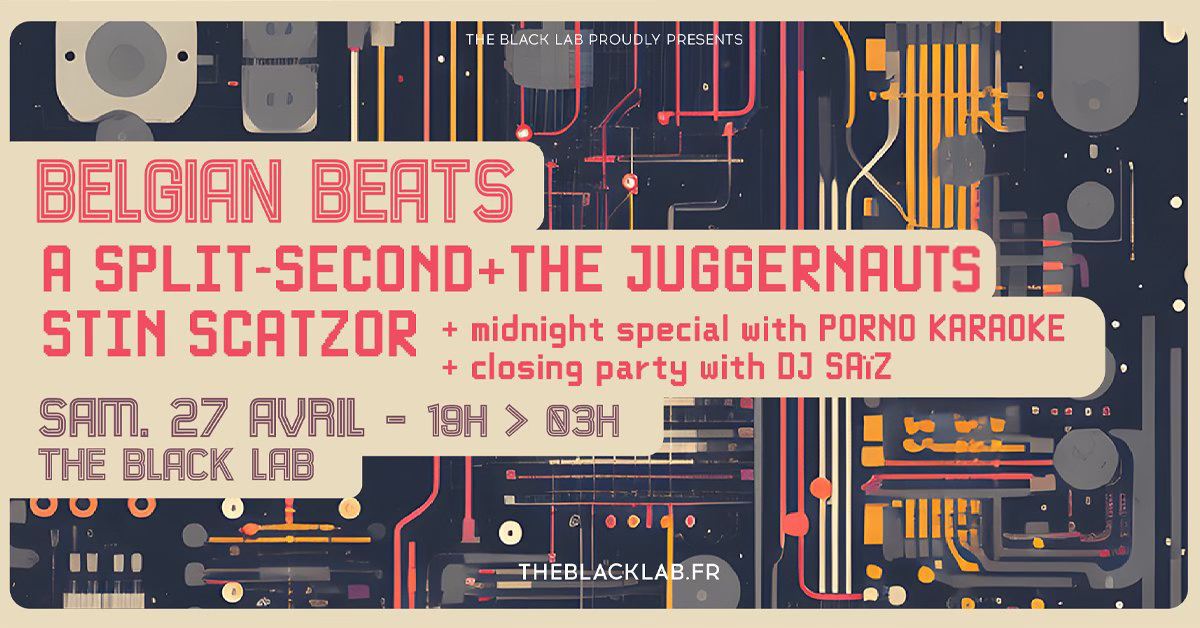 Het eerstkomende event gaat door op 27 april in The Black Lab in Lille (FR), met optredens van A Split Second, The Juggernauts, Stin Scatzor en een middernachtspecial door Porno Karaoke. De nacht wordt dus gevuld met een portie van de beste Belgische beats, tot en met de party, voorzien van het zwarte gebons door dj SAïZ.