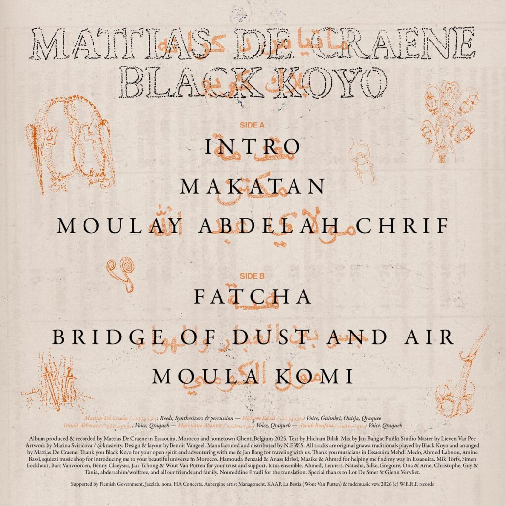 De tracks op het album zijn allemaal eigentijdse interpretaties van gnawa-traditionals. In de gnawa muziek staat een korte, muzikale frase (je zou het een riff kunnen noemen) centraal. Die wordt steeds opnieuw herhaald en brengt de luisteraar zo langzaam in trance. Wat deze plaat zo bijzonder maakt is de combinatie van traditionele zang, het gebruik van instrumenten als de guibri en de qraqueb, de vraag-antwoord-gezangen door Ismael Akhraz en Marwan Abantor en de vertellende stem van hoofd-koyo Hicham Bilali enerzijds, en de nogal etherische saxofoonklanken, loops en elektronica van Mattias De Craene anderzijds. Een ongewone combinatie die wonderwel werkt en tegelijk hedendaags én traditioneel aanvoelt.