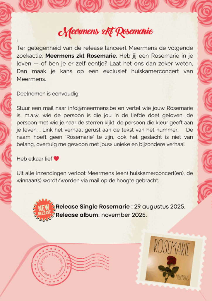 Naast een oprecht mooie Nederlandstalige meezingpopsong, krijg je misschien nog meer van Meermens, want wie een Rosemarie in zijn/haar/hun leven heeft maakt kans op een huiskamerconcert!
